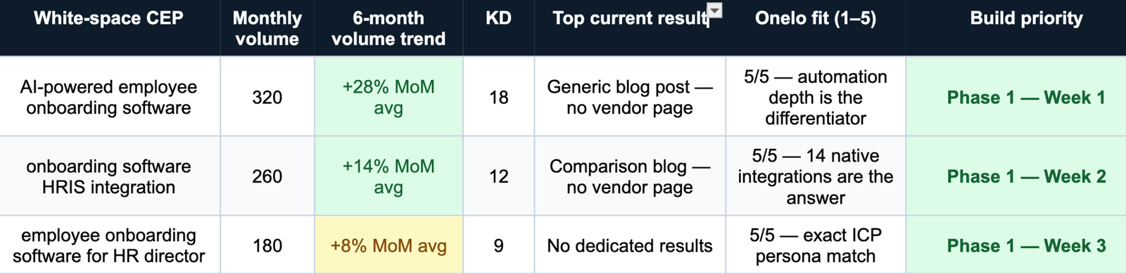White-space CEPs are not consolation prizes. A buyer searching ’employee onboarding software for HR director’ with that specificity is in active evaluation. The conversion rate on traffic from this query will be significantly higher than traffic from a broad category term. Build these three pages in weeks 1–4 of Phase 1.